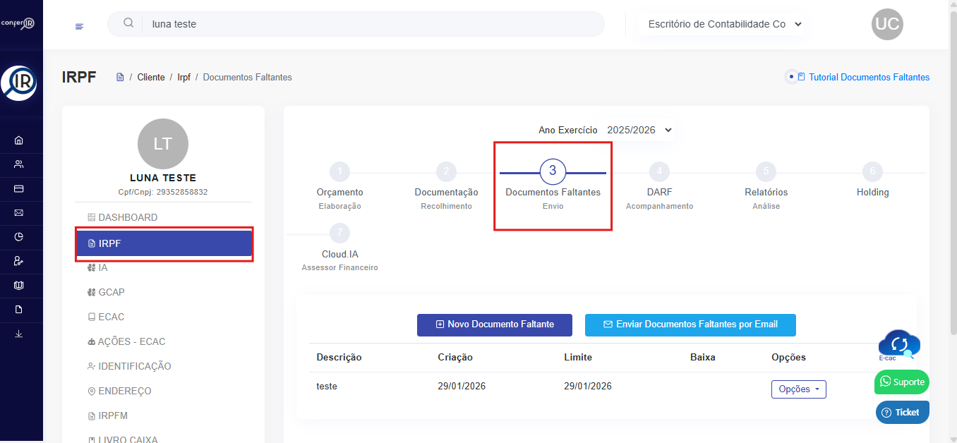 1- Para criar uma pendência de documentação, basta ir em documentação