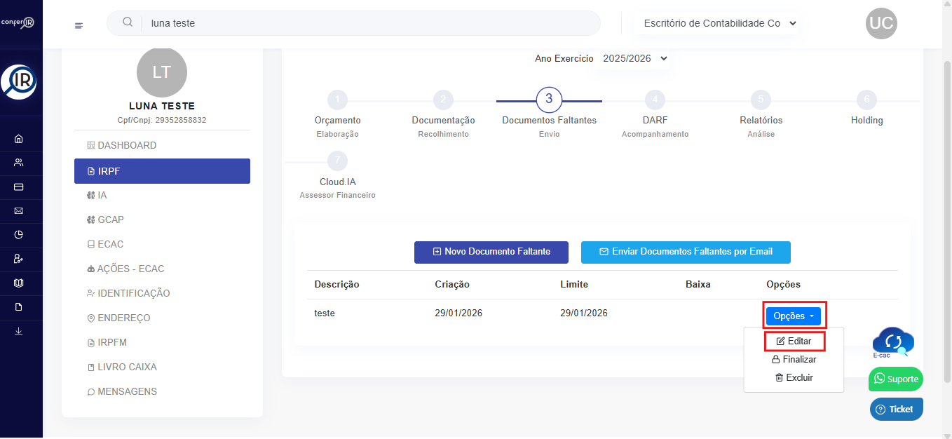1- Para alterar uma pendência, basta clicar em opções e clicar em Editar
