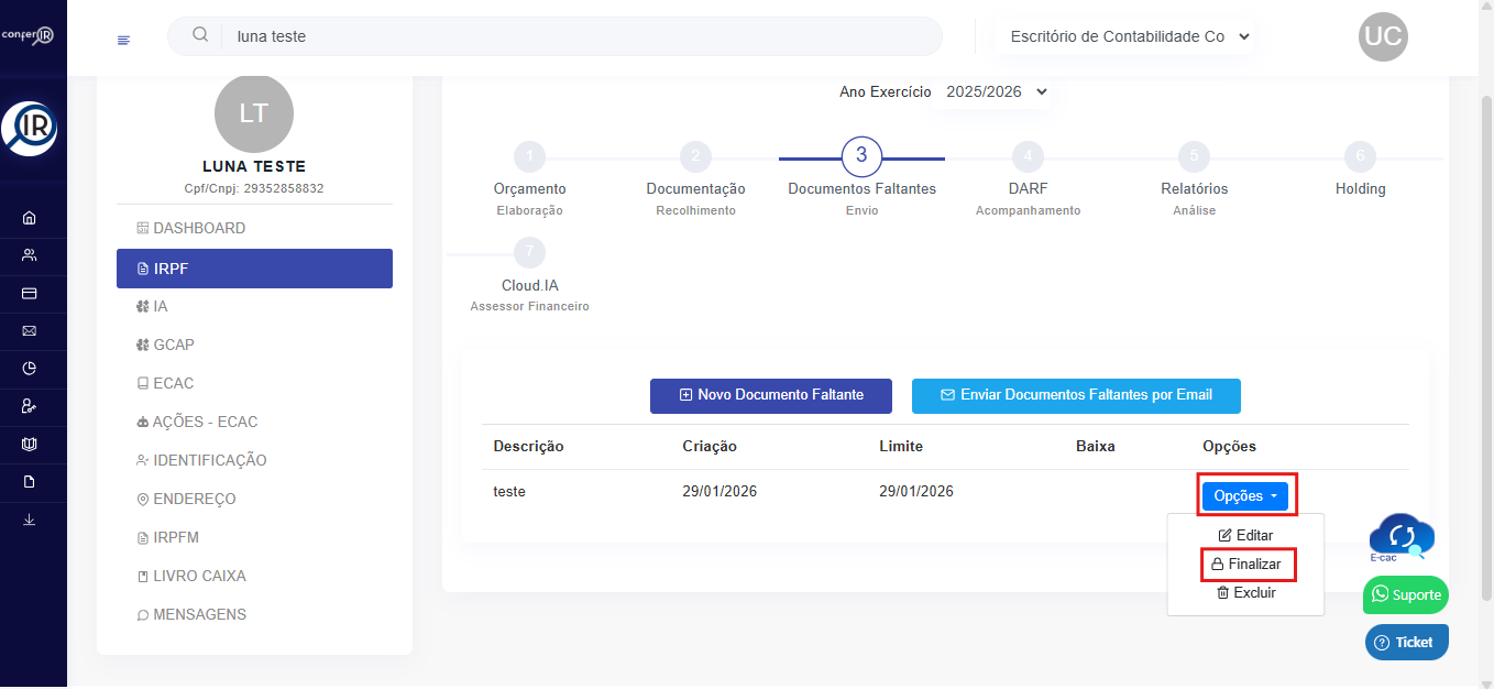 2- Após o cliente ter enviado a documentação corretamente conforme o solicitado, basta finalizar a pendência clicando em Opções > Finalizar e confirme no botão Sim, caso esteja tudo correto.