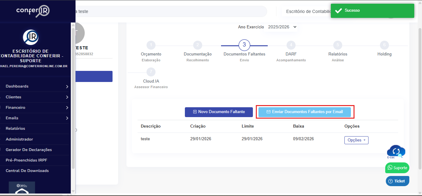 3- Clicando em Enviar pendências por e-mail, as pendências relacionadas ao cliente serão enviado por e-mail cadastrado.