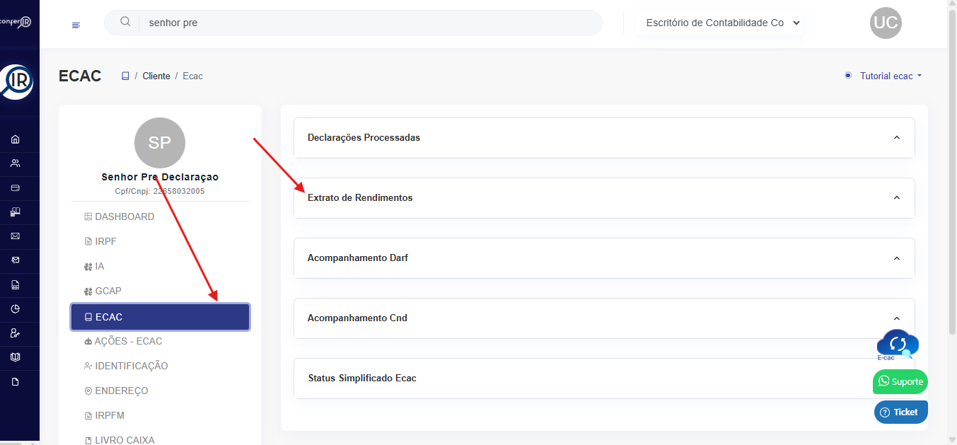 3. Ao selecionar o cliente, no menu do cliente selecione a opção ECAC