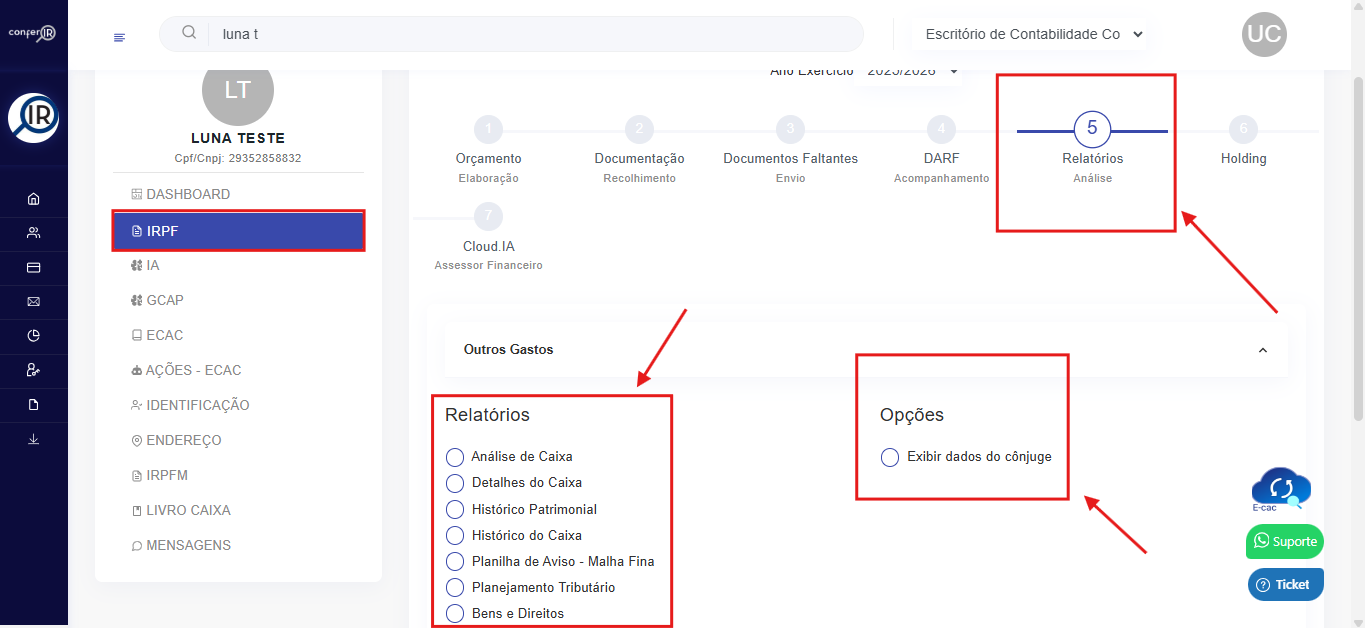 3. Clique na opção IRPF, no menu que aparece logo abaixo do nome do seu cliente, depois vá no passo , Relatório.