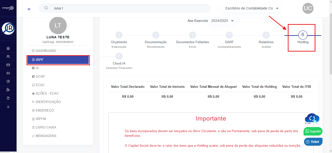 3. Acesse o Perfil do cliente e Clique em IRPF em seguida clica em Holding