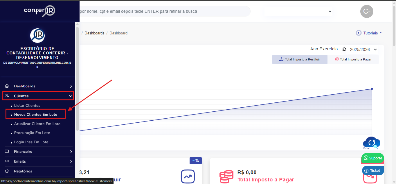 1- No menu lateral da esquerda, vá para Clientes e em seguida clique em Novos Clientes em Lote
