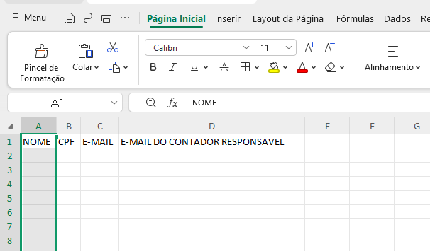 3- Abra a planilha no seu computador e preenha os campos adequadamente para cada coluna. Após preencher, tudo corretamente, salve em algum lugar que saiba onde ficará armazenado.