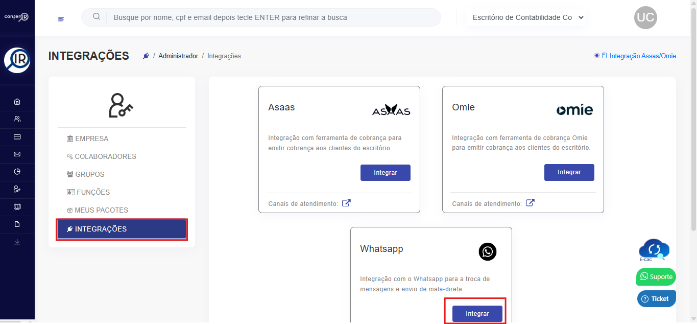 Dentro da área do administrador, clique em Integrações.