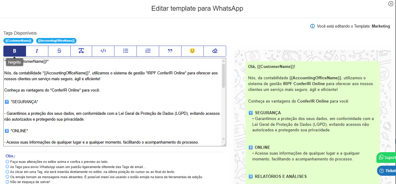 Nessa tela, você consegue personalizar as mensagens que serão enviadas para seus clientes, deixando o texto com a identidade do seu escritório (ex.: nome, tom de comunicação, instruções, assinatura, informações de contato, etc.).