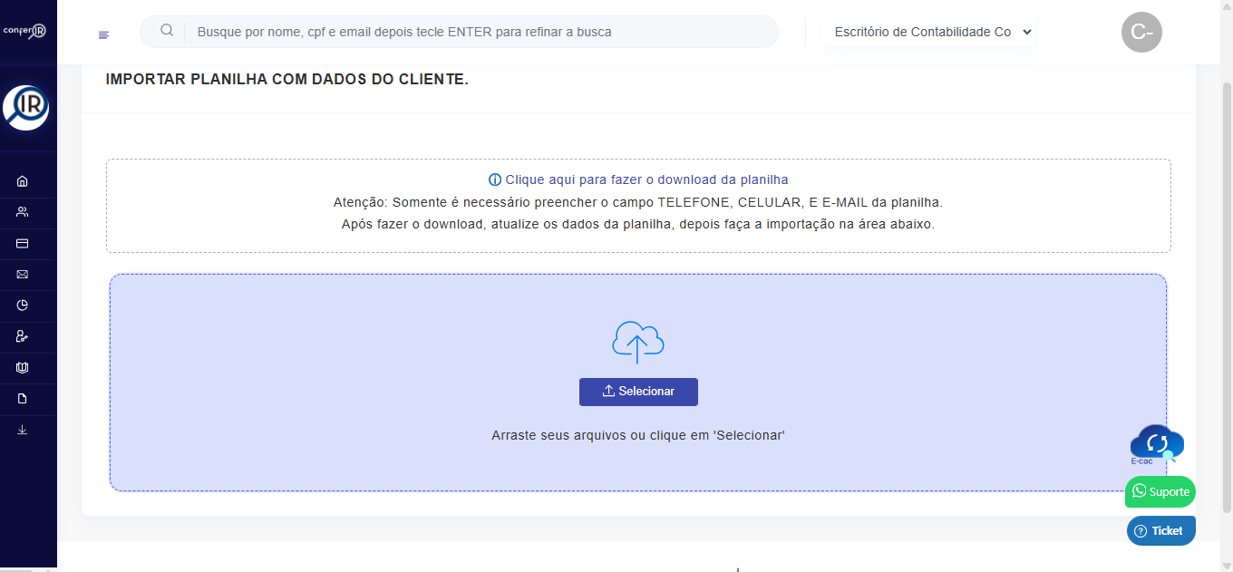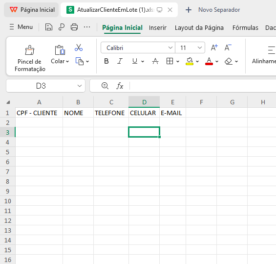 A planilha baixada já vem pré-preenchida com os clientes cadastrados.