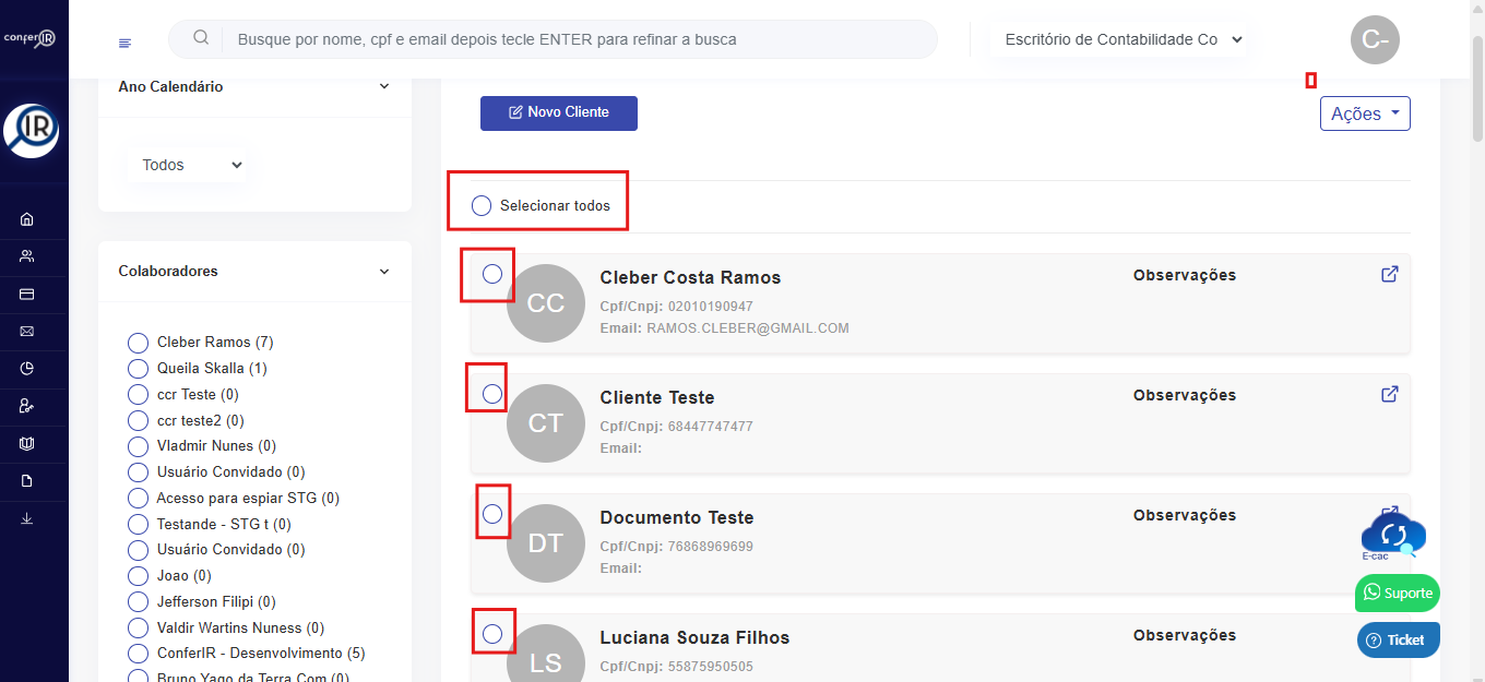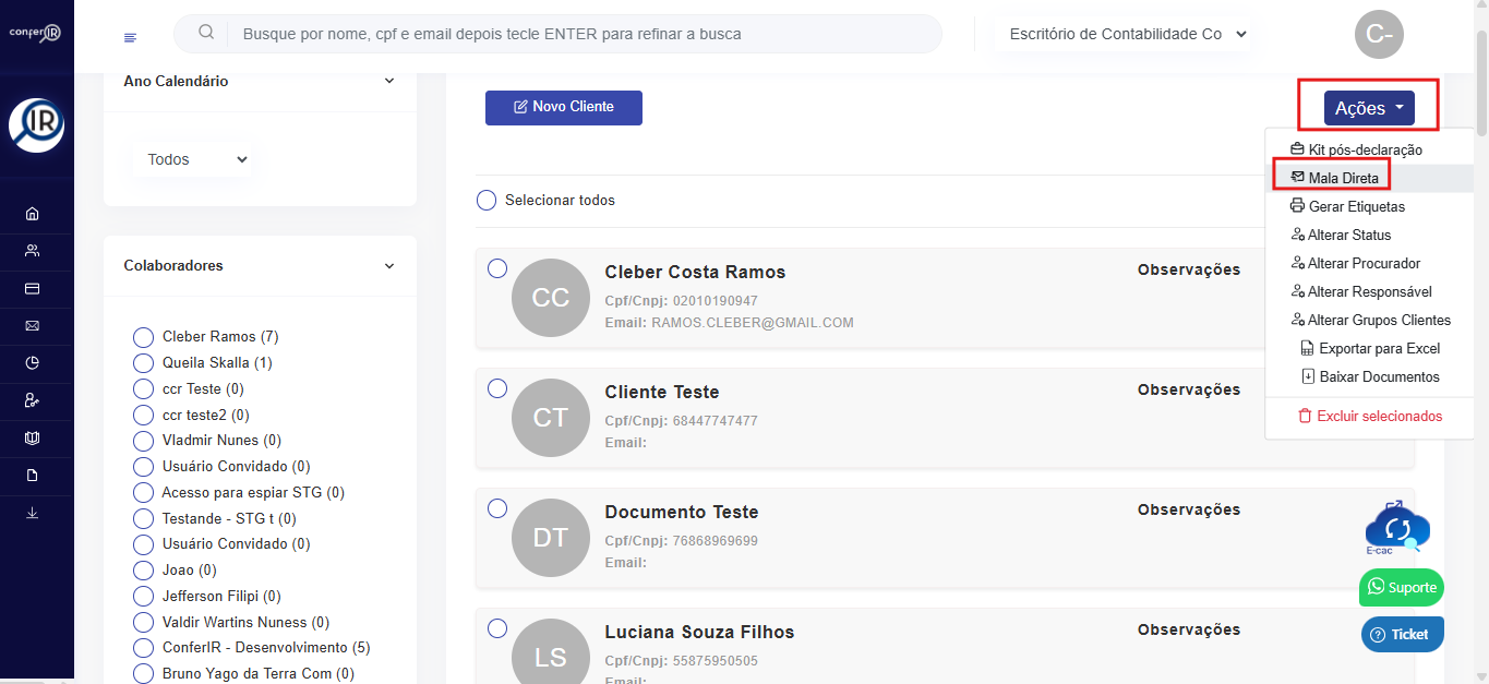 Após selecionar os clientes, vá até o lado direito da tela, no campo Ações.